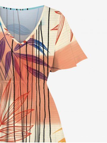 Robes Graphiques > Robe Mi-Longue Bouclée en Blocs de Couleurs Feuille Branche Imprimée de Grande Taille avec Poche