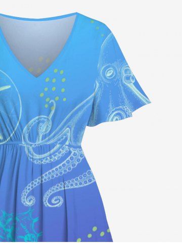 Robe Mi-Longue Fendue Cousue Ligne A Fleurie Etoile de Mer de Grande Taille avec Poche - Bleu Ciel - Bleu Ciel