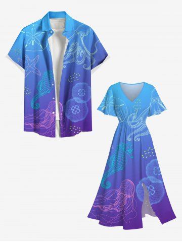 Robes Graphiques > Robe Mi-Longue Fendue Cousue Ligne A Fleurie Etoile de Mer de Grande Taille avec Poche