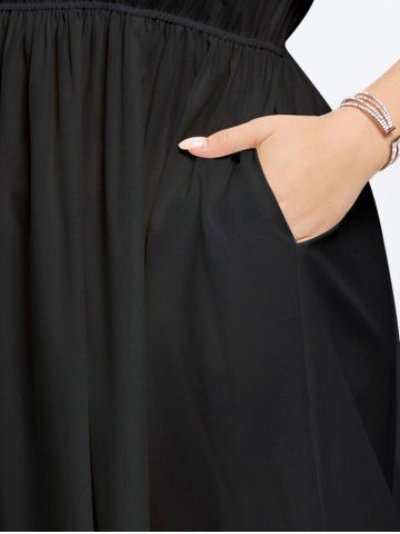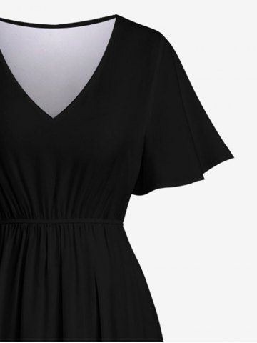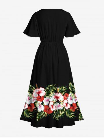 Robe Mi-Longue Fendue Fleur D'Hibiscus et Feuille Tropicale Imprimées de Grande Taille - Noir - Noir