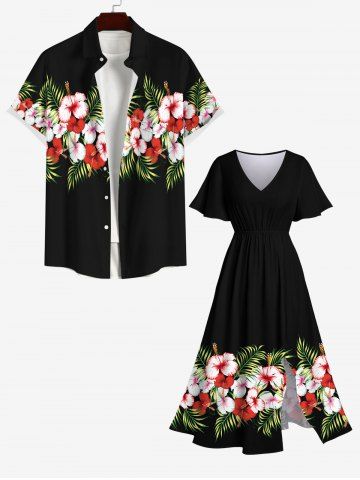Tropical Leaf Hibiscus Flowers Print Plus Size Matching Hawaii Beach Outfit For Couples