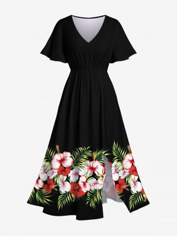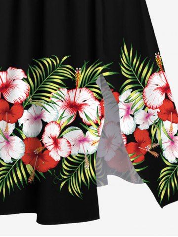 Robe Mi-Longue Fendue Fleur D'Hibiscus et Feuille Tropicale Imprimées de Grande Taille - Noir - Noir