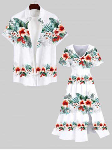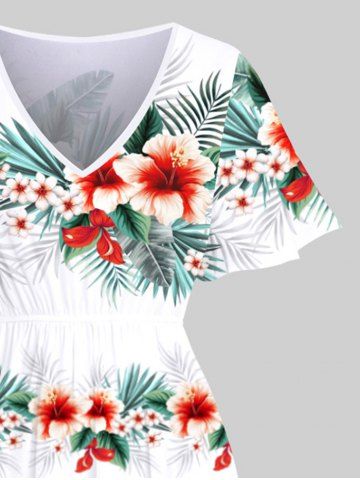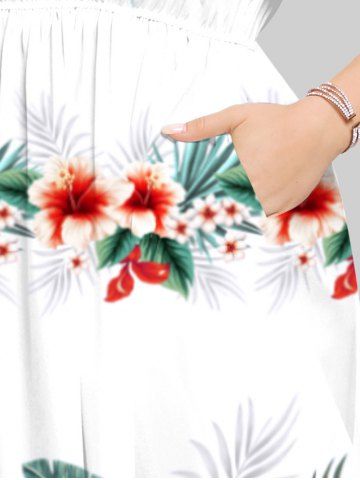 Robe Mi-Longue Fendue Fleur D'Hibiscus et Feuille Tropicale Imprimées de Grande Taille - Blanc - Blanc