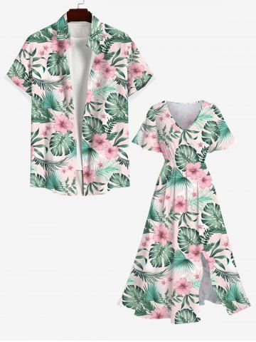 Robes Graphiques > Robe Mi-Longue Fendue Fleur D'Hibiscus et Feuille Tropicale Imprimées de Grande Taille