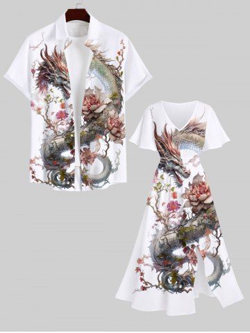 Robes Graphiques > Robe Mi-Longue Fendue Fleur Dragon Chinois de Grande Taille