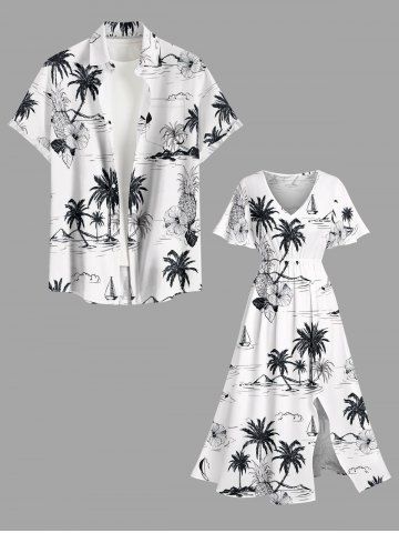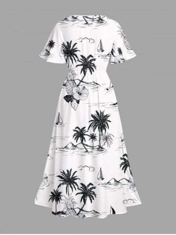 Robe mi-longue fendue hawaïenne à imprimé cocotier, ananas et fleurs d'hibiscus, grande taille - Blanc - Blanc