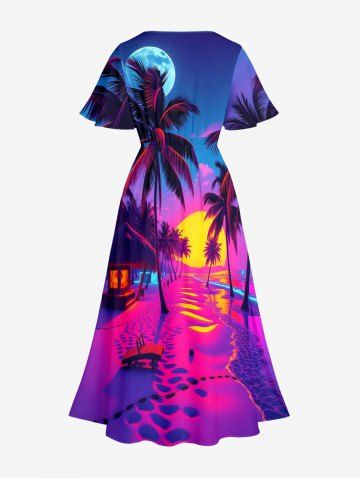 Robes Graphiques > Robe mi-longue fendue hawaïenne à imprimé cocotiers et soleil grande taille
