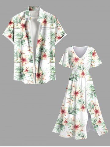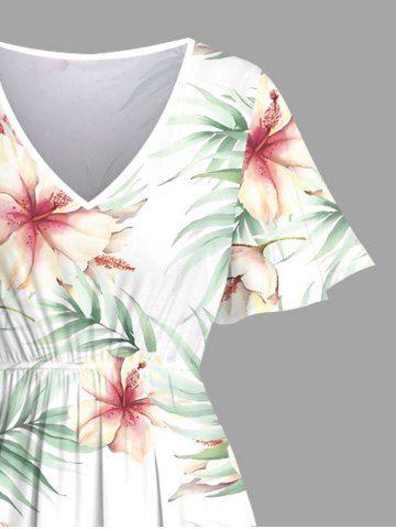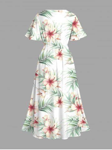 Robe mi-longue fendue hawaïenne à imprimé feuilles tropicales et fleurs d'hibiscus, grande taille - Blanc - Blanc