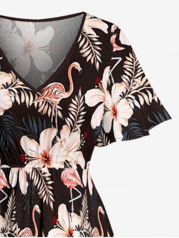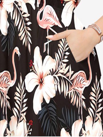 Robe mi-longue fendue hawaïenne à imprimé flamants roses et hibiscus, fleurs tropicales et feuilles, grande taille - Noir - Noir