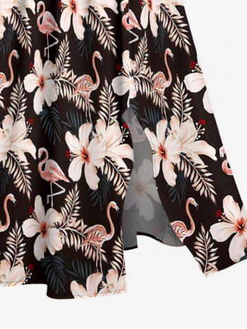 Robes Graphiques > Robe mi-longue fendue hawaïenne à imprimé flamants roses et hibiscus, fleurs tropicales et feuilles, grande taille
