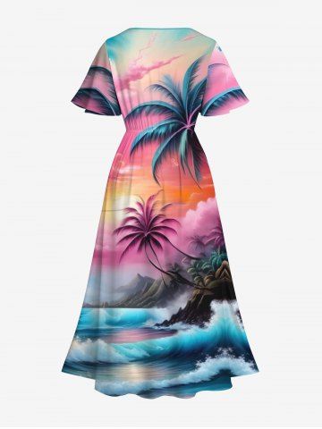 Robes Graphiques > Robe Mi-Longue Hawaïen Fendue Arbre Noix de Coco et Océan Imprimés de Grande Taille