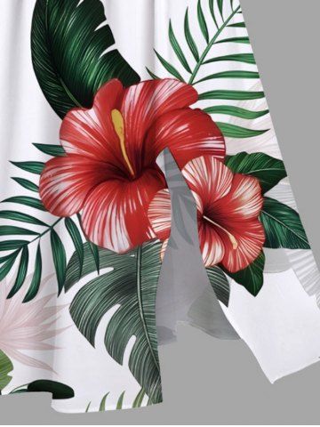 Robe mi-longue hawaïenne à imprimé feuilles tropicales et fleurs d'hibiscus, grande taille, coupe trapèze fendue avec poches - Blanc - Blanc