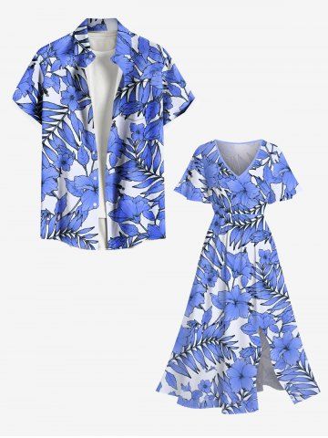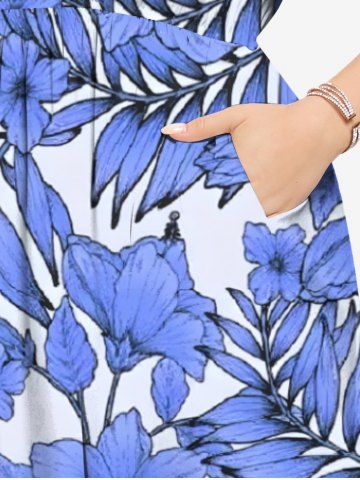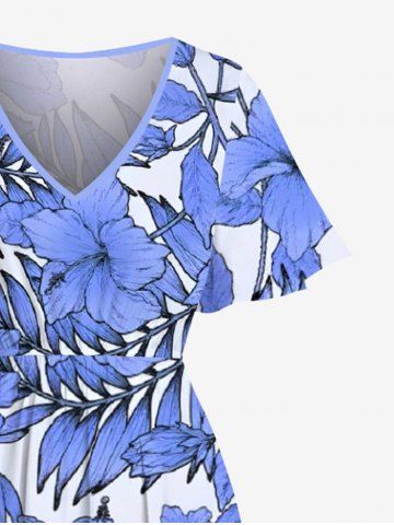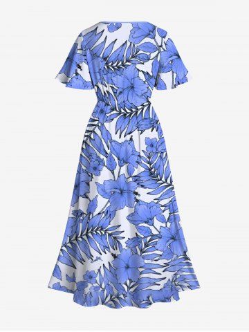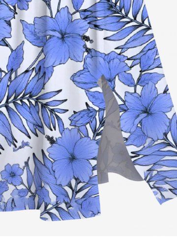 Robe mi-longue hawaïenne fendue à imprimé de fleurs d'hibiscus et de feuilles, grande taille - Bleu - Bleu