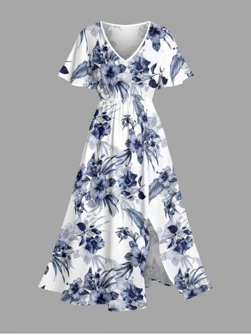 Robe mi-longue hawaïenne fendue à imprimé de fleurs d'hibiscus et de feuilles, grande taille - Cadetblue - L