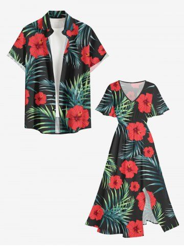 Robes Graphiques > Robe mi-longue hawaïenne fendue à imprimé feuilles tropicales et fleurs d'hibiscus (grande taille)
