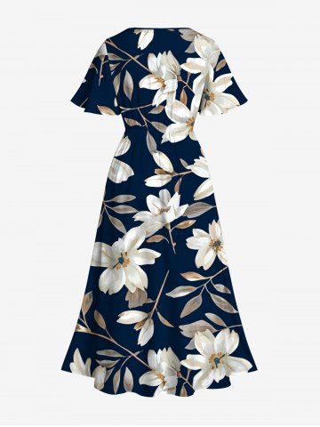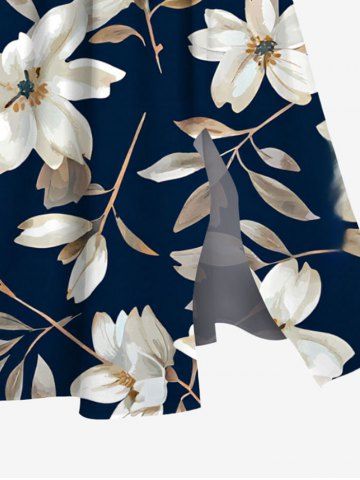 Robe mi-longue hawaïenne fendue à imprimé floral et feuilles grande taille - Bleu De Minuit - S
