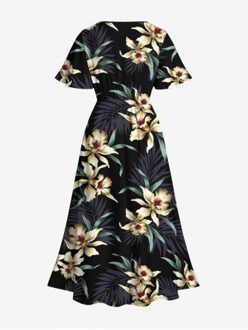 Robe mi-longue hawaïenne fendue à imprimé floral et feuilles grande taille - Noir - Noir