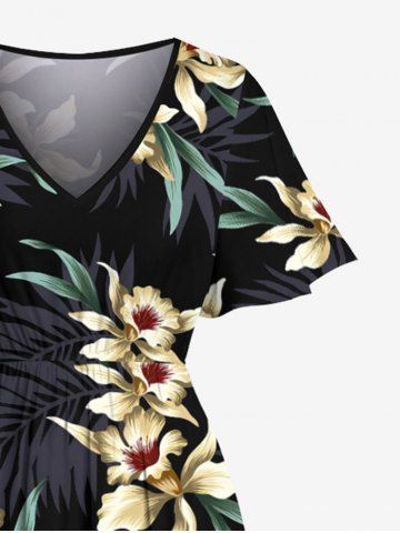 Robe mi-longue hawaïenne fendue à imprimé floral et feuilles grande taille - Noir - Noir