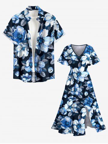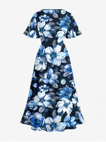 Robe mi-longue hawaïenne fendue à imprimé floral et feuilles grande taille - Bleu Profond - 6x