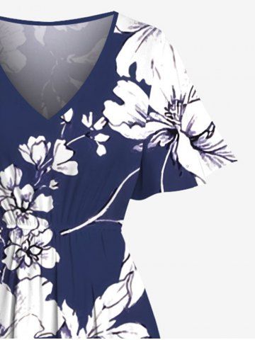 Robe mi-longue hawaïenne fendue à imprimé tropical et fleurs grande taille - Bleu Profond - S