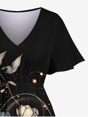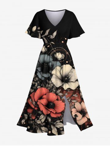 Robe mi-longue hawaïenne fendue grande taille à imprimé 3D de fleurs et de feuilles scintillantes - Noir - Noir