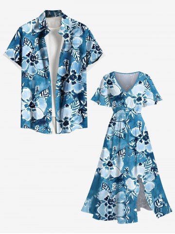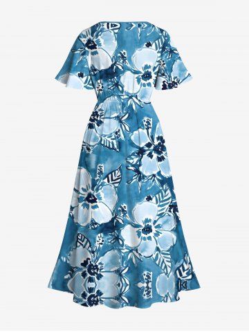 Robe mi-longue hawaïenne fendue grande taille à imprimé aquarelle, fleurs tropicales et feuilles - Bleu Ciel - Bleu Ciel