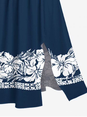 Robe mi-longue hawaïenne fendue grande taille à imprimé feuilles tropicales et fleurs d'hibiscus - Bleu Profond - S