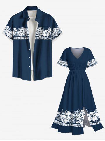 Robe mi-longue hawaïenne fendue grande taille à imprimé feuilles tropicales et fleurs d'hibiscus - Bleu Profond - 2x
