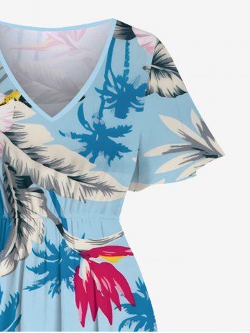 Robe mi-longue hawaïenne fendue grande taille à imprimé fleurs d'hibiscus, feuilles et cocotiers - Bleu Clair - Bleu Clair