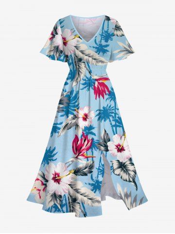 Robes Graphiques > Robe mi-longue hawaïenne fendue grande taille à imprimé fleurs d'hibiscus, feuilles et cocotiers