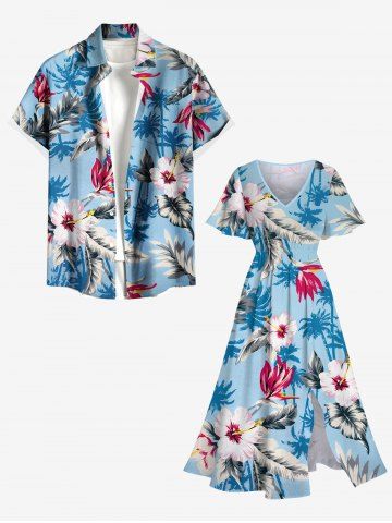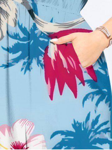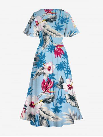Robe mi-longue hawaïenne fendue grande taille à imprimé fleurs d'hibiscus, feuilles et cocotiers - Bleu Clair - Bleu Clair