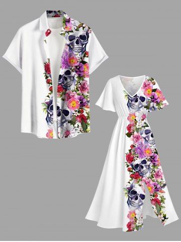 Robe mi-longue hawaïenne grande taille à imprimé tête de mort et fleurs colorées avec poches fendues - Blanc - Blanc