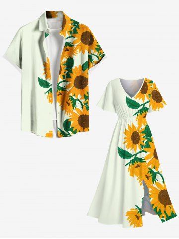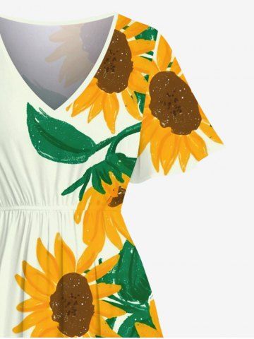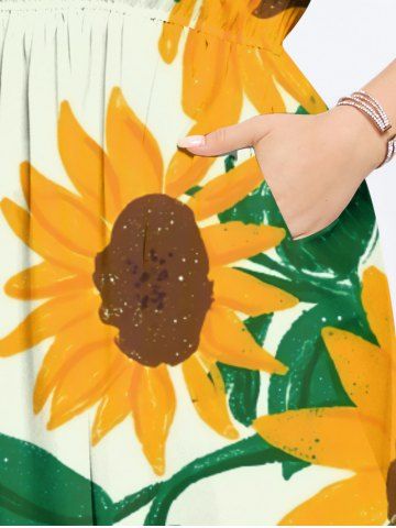 Robes Graphiques > Robe Mi-Longue Linge A Tournesol Imprimé Fendue avec Poche de Grande Taille
