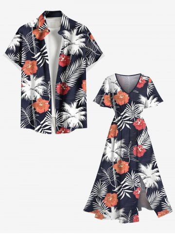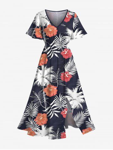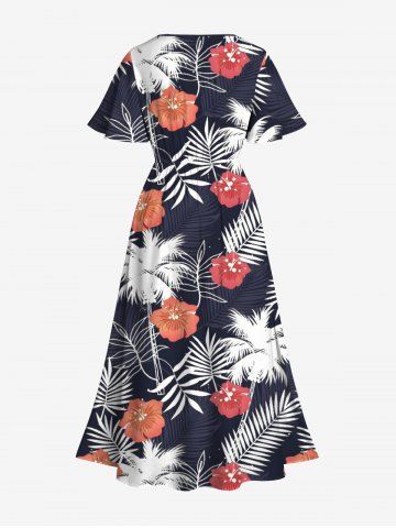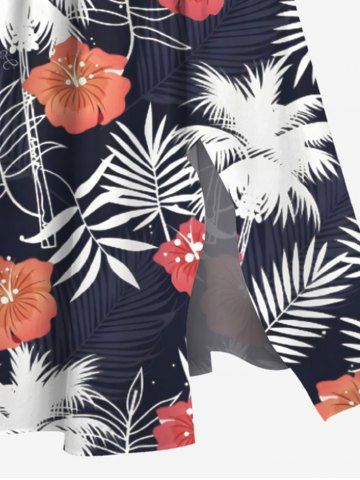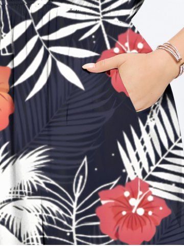 Robes Graphiques > Robe mi-longue trapèze grande taille à imprimé feuilles tropicales, cocotiers, fleurs d'hibiscus, style hawaïen, poches fendues