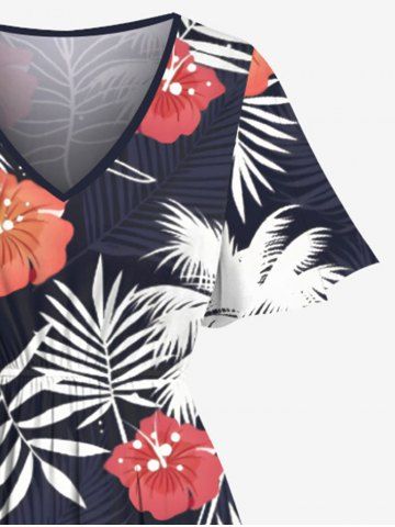 Robe mi-longue trapèze grande taille à imprimé feuilles tropicales, cocotiers, fleurs d'hibiscus, style hawaïen, poches fendues - Bleu - Bleu