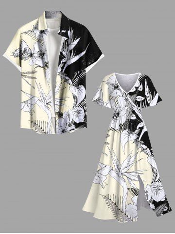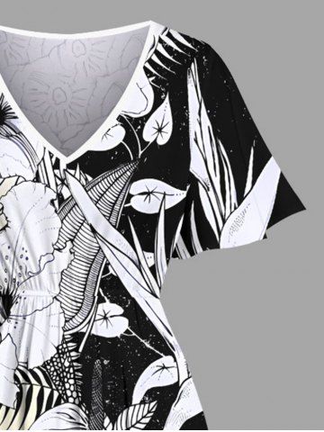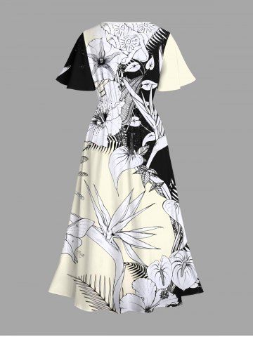 Robes Graphiques > Robe mi-longue trapèze grande taille à imprimé feuilles tropicales, hibiscus, branches, poches fendues, style hawaïen
