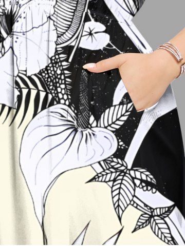 Robe mi-longue trapèze grande taille à imprimé feuilles tropicales, hibiscus, branches, poches fendues, style hawaïen - Blanc - Blanc