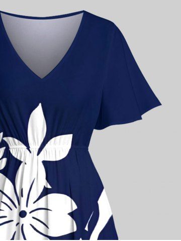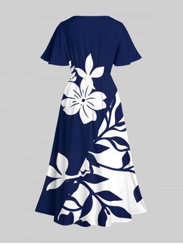 Robe mi-longue trapèze hawaïenne à imprimé bicolore contrasté, grande taille, avec poches fendues et motif floral et branches - Bleu Profond - Xxs