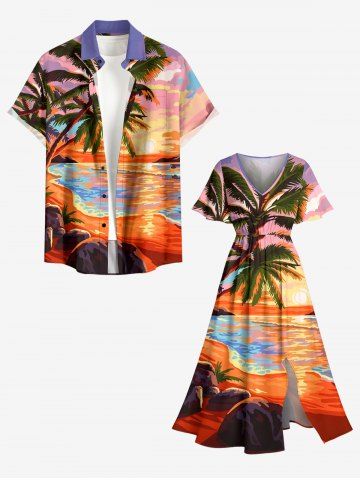 Robes Graphiques > Robe midi fendue hawaïenne à imprimé cocotier et paysage marin grande taille