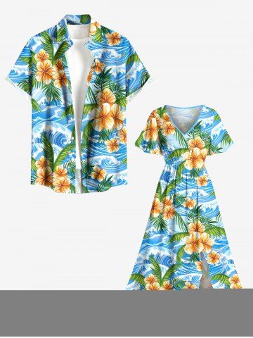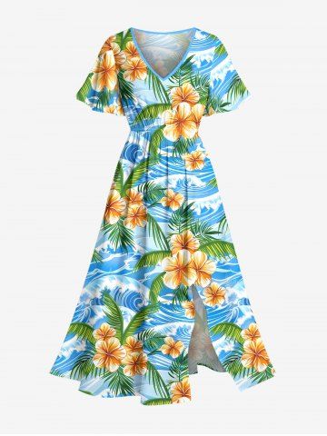 Robe midi fendue hawaïenne à imprimé fleurs, feuilles et vagues, grande taille - Bleu Ciel - Bleu Ciel