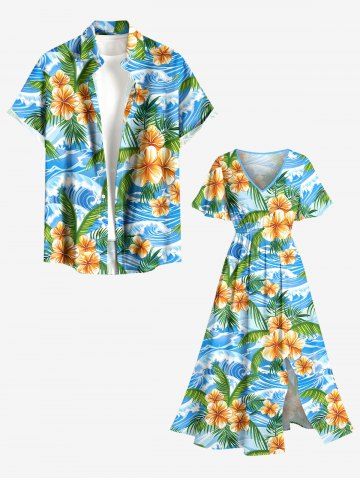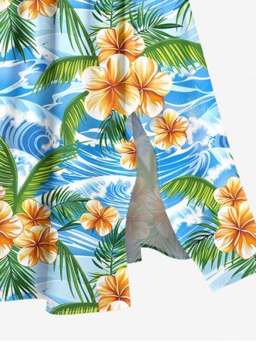 Robe midi fendue hawaïenne à imprimé fleurs, feuilles et vagues, grande taille - Bleu Ciel - Bleu Ciel
