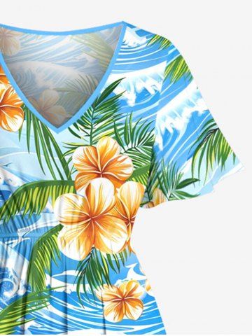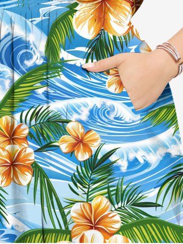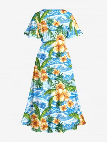 Robe midi fendue hawaïenne à imprimé fleurs, feuilles et vagues, grande taille - Bleu Ciel - Bleu Ciel