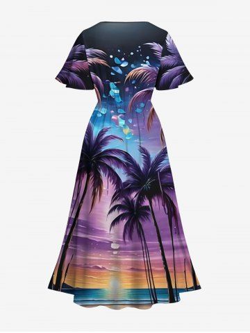 Robe midi fendue hawaïenne à imprimé galaxie, cocotier et paysage marin, grande taille - Pourpre - Pourpre