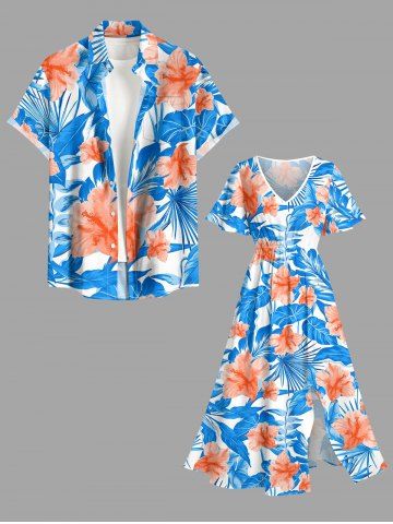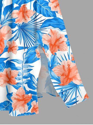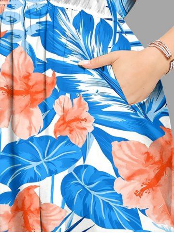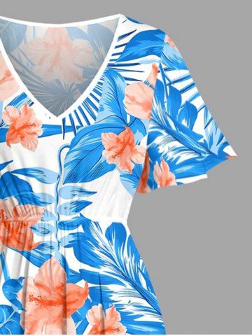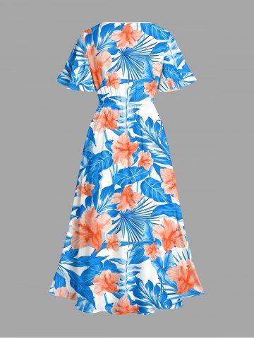 Robe midi hawaïenne à imprimé feuilles et fleurs d'hibiscus grande taille, cache-cœur - Bleu Ciel - Bleu Ciel