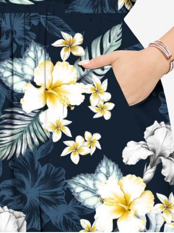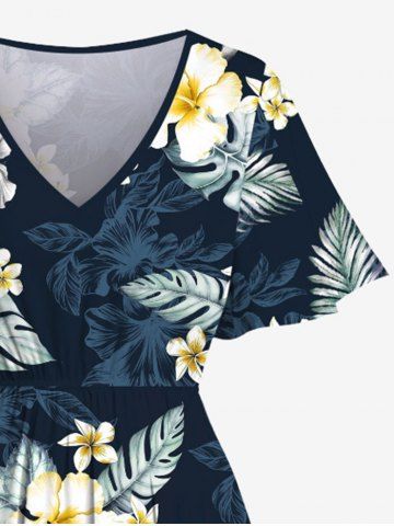 Robe midi hawaïenne fendue à imprimé feuilles tropicales et fleurs d'hibiscus (grande taille) - Bleu Marine - Bleu Marin