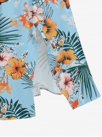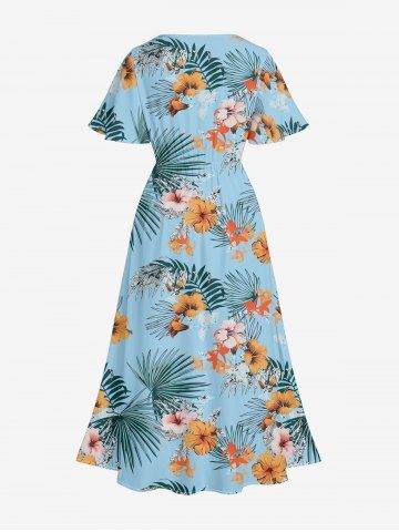 Robe midi hawaïenne fendue à imprimé feuilles tropicales et fleurs d'hibiscus (grande taille) - Bleu Toile De Jean - L