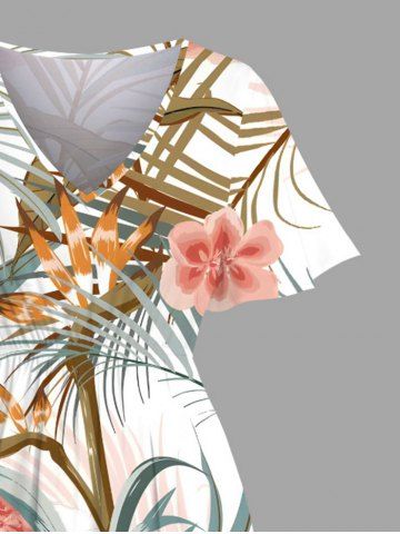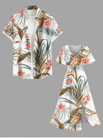 Robe midi hawaïenne fendue à imprimé floral tropical et feuilles grandes tailles - Blanc - Blanc