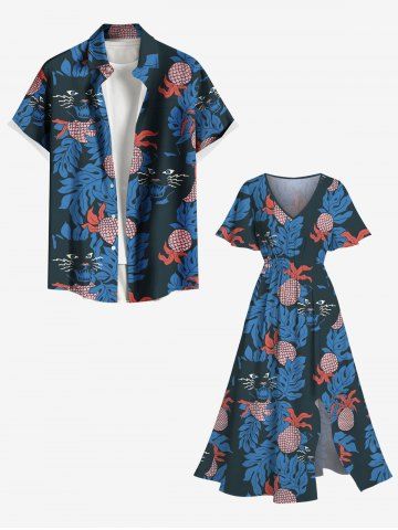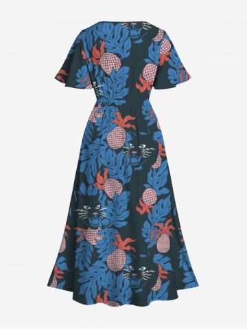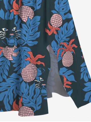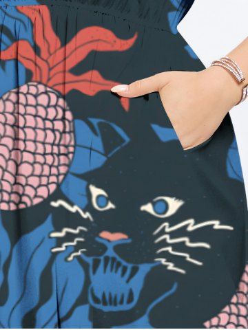 Robe midi trapèze grande taille à imprimé ananas et chat tropical et feuilles hawaïennes, poche fendue. - Bleu - Bleu