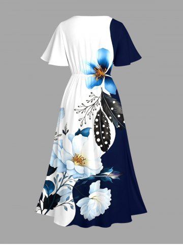 Robe midi trapèze grande taille à imprimé fleurs et feuilles hawaïennes avec poches fendues - Bleu Profond - Xs