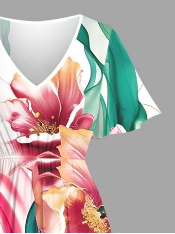 Robe midi trapèze grande taille à imprimé floral aquarelle et ruban hawaïen avec poche fendue - Blanc - Blanc